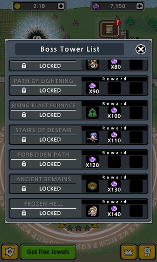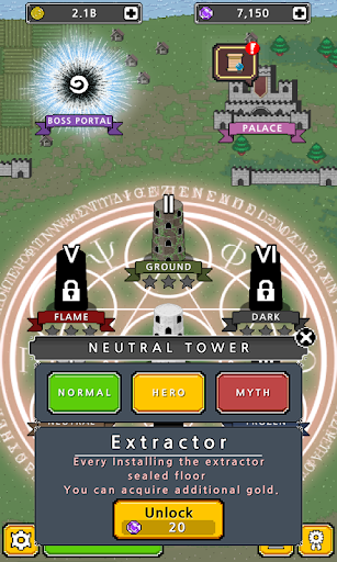: Normal, Hero, and Legend modes are available. A powerful boss monster waits at the top of each tower.
