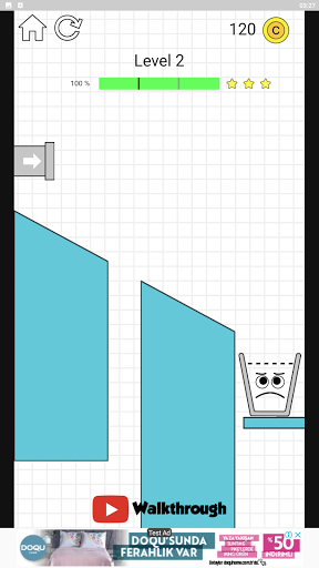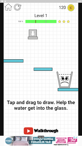 You are trying to fill water into the empty glass on the Happy glass 3 game screen. you draw the path that the water will flow on the screen with your finger. The amount of ink in your pen appears at the top of the screen. You can observe the amount of ink remaining here as you draw the path. When the water fills up to the part of the glass indicated by the dashed lines, you complete the section and move on to the next section.
