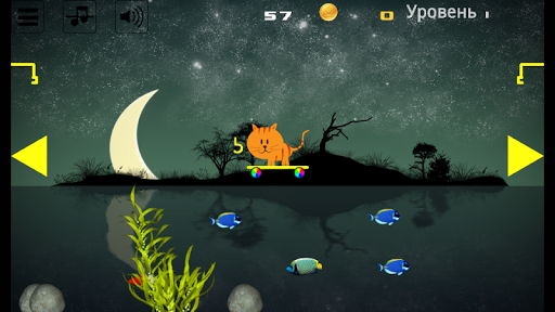 The essence of the game: the cat is floating on a boat, and catching fish. The cat should have time to catch all the fish to pass the level.