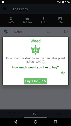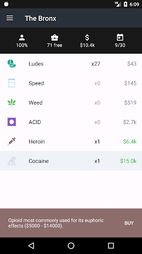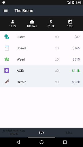 The New York of Dope Wars is divided into 5 locations. At each of these locations, a variety of drugs, with fluctuating prices, are on sale.