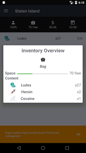 The aim of the game is to make lots and lots of money. Unfortunately the cops take a rather dim view of drug dealing, competition is murderous and your financiers are not always cooperative.
