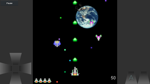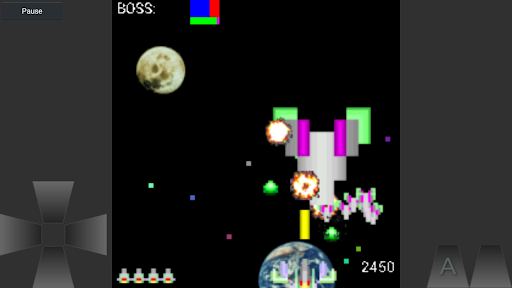 Control your spacecraft with the gamepad in the lower left corner. Use the decision and manual shot button in the lower right corner. Use the horizontal A/M button in the lower right corner to switch between auto and manual firing.