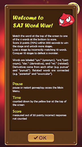 SAT Word War will make the SAT less hostile by giving you a monstrously large vocabulary. By waging war against 8 fierce monsters and fighting your way through the ten stages of combat for each monster, you will test your understanding of 2400 of the most common SAT words.