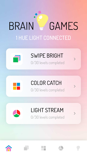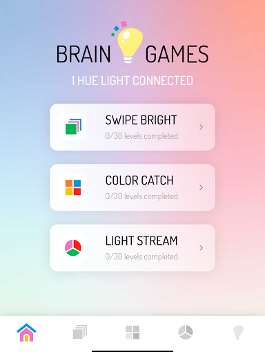 Each of the three brain games has 30 levels of increasing difficulty and a classic gaming mode to beat your high score. In the game ‘Light Stream’ you have to watch, remember and repeat an increasing sequence of colors, presented by your Hue light. Train your short-term memory and attention and make sure to remember the sequence correctly. In ‘Color Catch’ you get a few seconds to memorize a pattern of colors. Afterwards, you have to click the tiles with the color chosen by you Philips Hue light. Train your concentration, attention and mental flexibility in the game ’Swipe Bright’, a fun version of the famous neuropsychological ‘Stroop test’. If the word or color on the cards corresponds to the color of your Hue light, you have to swipe the card to the right, otherwise swipe it left.