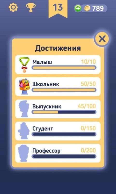 2 - кубок, где вы можете отслеживать свои достижения. Игра предполагает пять званий для игрока. Когда вы разгадаете 10 слов, вы будете Малышом, когда 50 слов - станете Школьником, когда 100 слов - уже Выпускником, 150 слов - это достижение Студента, а отгадав 200 слов, вы удостоитесь звания Профессора!