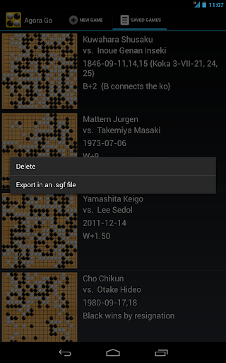 * export games in SGF files on the built-in storage (in the "Agora Go" directory)
