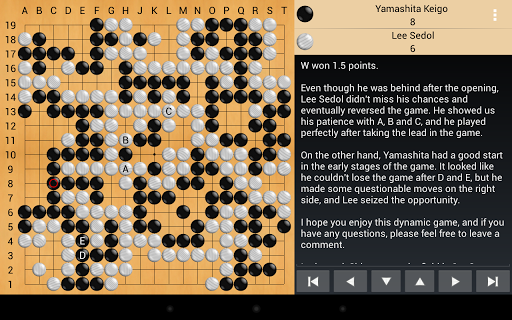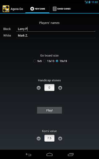 Agora Go is optimized to run on as many display sizes and resolutions as possible, with nice graphics on Android smartphones, MP3 players, tablets (up to 13-inch screens so far), as well as Android laptops and TVs. A large screen will offer the best experience, especially when playing on 19x19 boards.