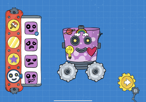 Nick designed a robot which your child can customize as her very own. Kids can use stickers and patterns they find as they play through each level. They can also pick their robot’s emotion - cheerful, silly, grumpy, or sad – and watch how their robot responds.