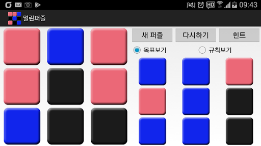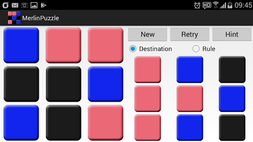 멀린게임은 3*3으로 배열된 9장의 카드를 정해진 게임방법에 따라 카드를 뒤집어서 목표와 같은 색깔의 배치를 만드는 퍼즐게임입니다.