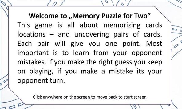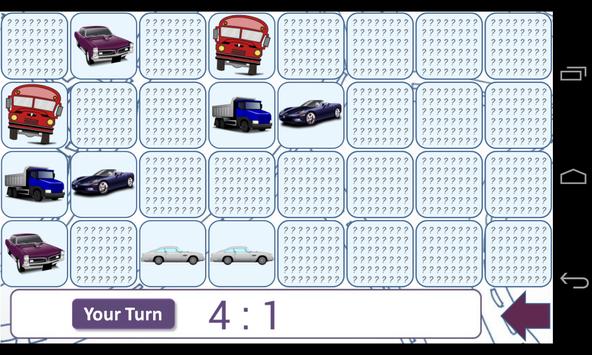 Game starts with all cards turned face down. When you tap one - it will turn and you need to remember the picture on it. Then - you should try to find the card with same picture as the uncovered one, and if they match - both will remain opened, you get one point and its still your turn. If you fail, the cards turn back and then it is your opponent turn. Look at your opponent moves to learn about other cards locations.There are various strategies - sometimes its better to loose at the beginning and then clean whole board in one long turn. Otherwise both cards will flip back over and you will get another try. Try to find all matched cards as fast as possible.