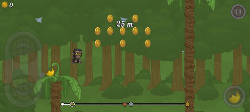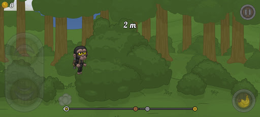 Use your jet pack to get through the jungle. Remember to avoid trees, birds and any other obstacles on your way. Collect bananas to gain advantage and make your way through by throwing them at your enemies to get as far as possible. Let's go!