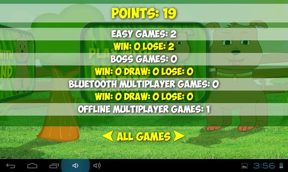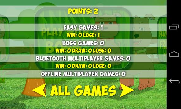 Dogs like different games. They play in the morning, at noon and in the evening. Dogs have many friends, but they would play with you too. Having fun is great! Play 6 excellent games: Find the Dog, Dog Sweeper, Dog Island, 5 Dogs, Dogs vs Cat and Dogs Jumpers and choose your favorite game. Then invite to play your friend and try to beat him in one of the games. In multiplayer mode (offline or Bluetooth) you spend long hours, because this game is addictive. When you get some points, log on to G + and see which place you have in the world ranking.