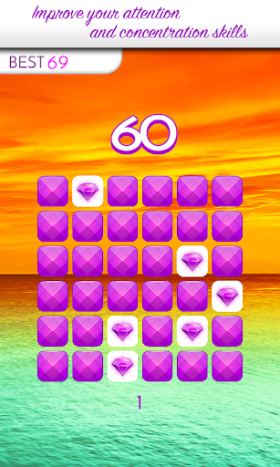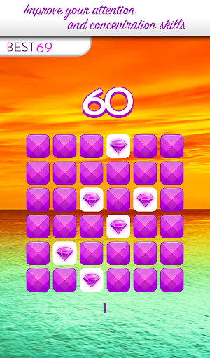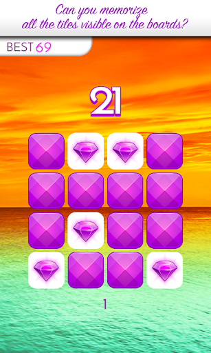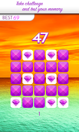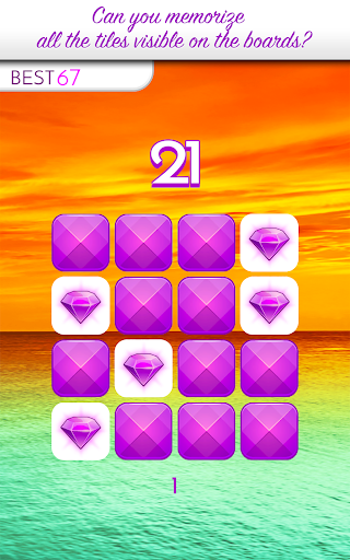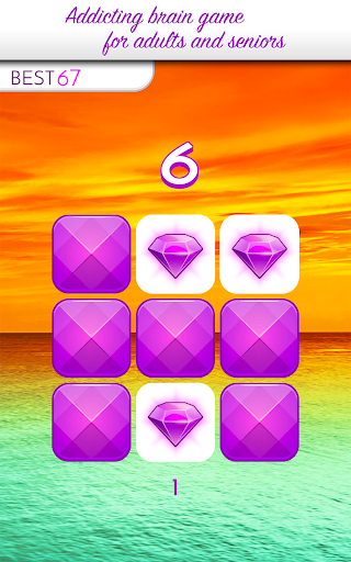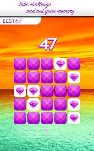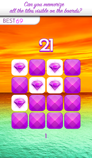 Can you memorize and recreate pattern of tiles with jewels on 3x3 board? Can you do it on 4x4, 5x5 and 6x6 board? You have only one second to memorize a pattern. Looks simple? But is quite difficult. So, take a challenge and test your memory in this addicting brain teaser!