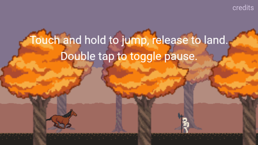A very simple time killer game. You control a horse who runs endlessly through a forest and must avoid skeletons. There are no ads. Easy and intuitive controls – tap and hold to jump, release to land. Double tap to enter pause mode. When you die, you just start over. I hope you'll enjoy the game and maybe chill out a bit. It might work as a stress reliever. :)