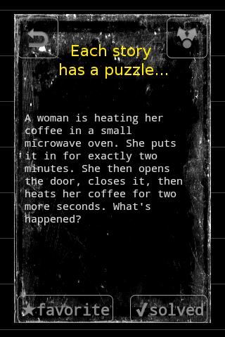 Stories are a special kind of riddles that are designed to be interactive. They are fun for car rides or other occasions. They are usually played in a group, with one person hosting the puzzle and the others asking questions which can only be answered with a "yes" or "no" answer. Depending upon the settings and level of difficulty, other answers, hints or simple explanations of why the answer is yes or no, may be considered acceptable. The puzzle is solved when one of the players is able to recite the narrative the host had in mind, in particular explaining whatever aspect of the initial scenario was puzzling.