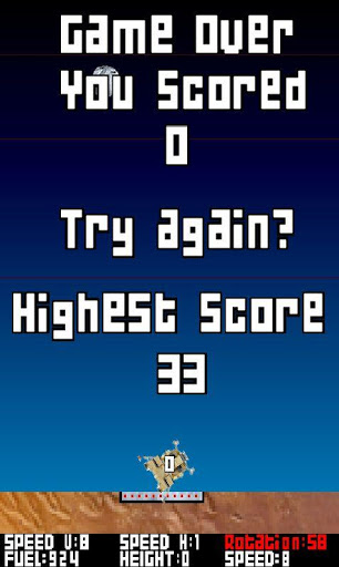 - hard landing (to much vertical or horizontal speed or to big rotation) = game over