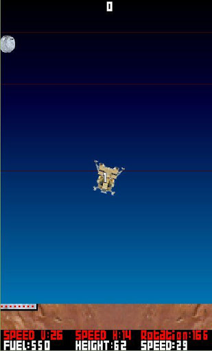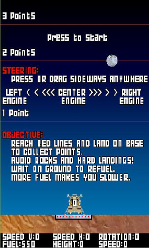 - reach red lines and land softly on landing pad to collect points