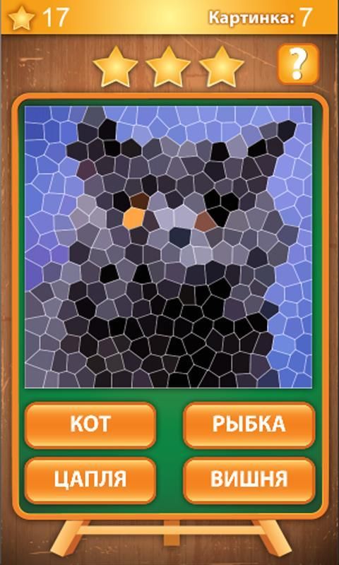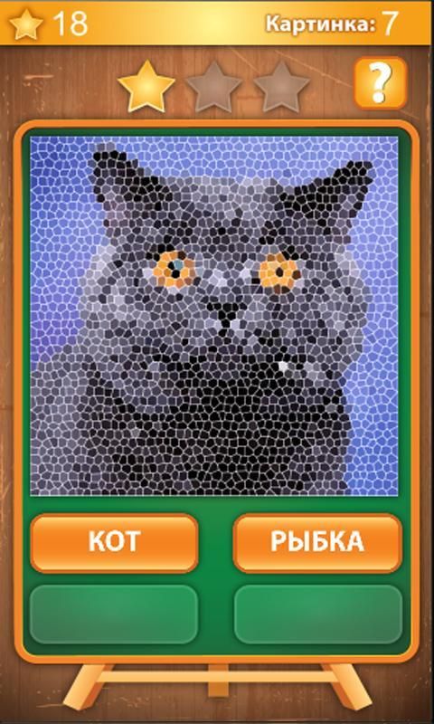 The goal of the game to guess the picture that is encoded as a mosaic, for that press one of four buttons that are located under the picture, if the answer is correct, all three star plus and move up to your stellar results. In case if the answer is not the correct one star falls and offers a simpler version of the encrypted image mosaic, and so on until you can not guess the correct picture. The number of stars is added to your stellar results vary depending on the number of attempts. Pictures have to guess the different subjects are animals, birds, fish, insects and fruit.