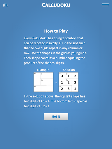 Every Calcudoku has a single solution that can be reached logically. Like Sudoku, fill in the grid such that no two digits repeat in any column or row. Use the shapes in the grid as your guide. Each shape contains a number equaling the product of the shapes' digits. For example a shape with three cells containing the number 6 may have cell values 1, 2 and 3, as 1 × 2 × 3 = 6. Challenge yourself further with larger grids for experts, up to 9x9 size!