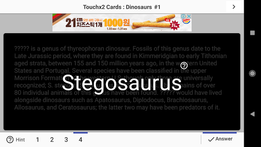 Can you guess the Dinosaur name by its image and text hints? - Easy Control Flash Cards Game - 24 Dinosaurs - 14 Languages Support