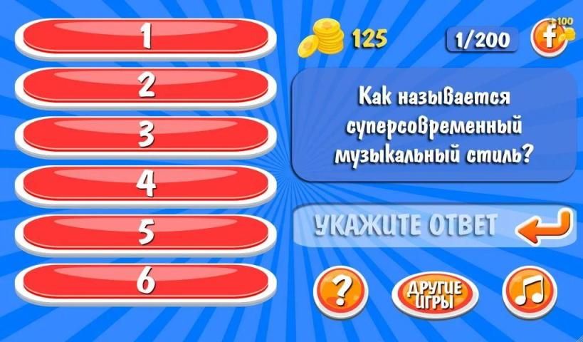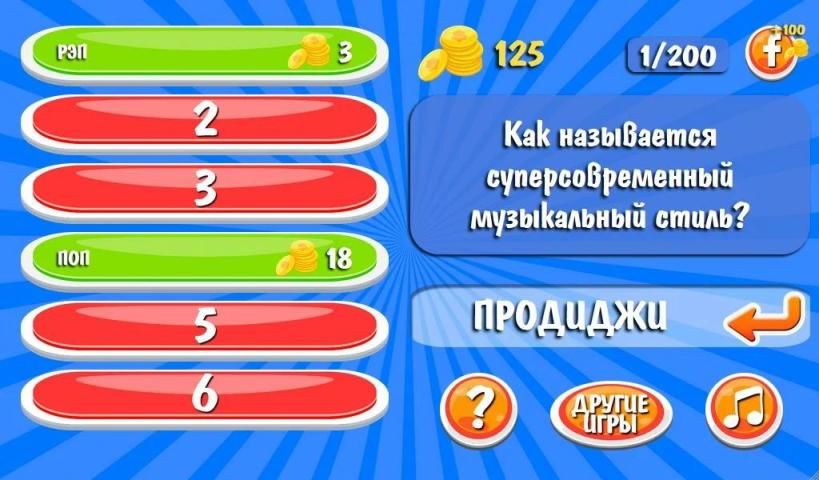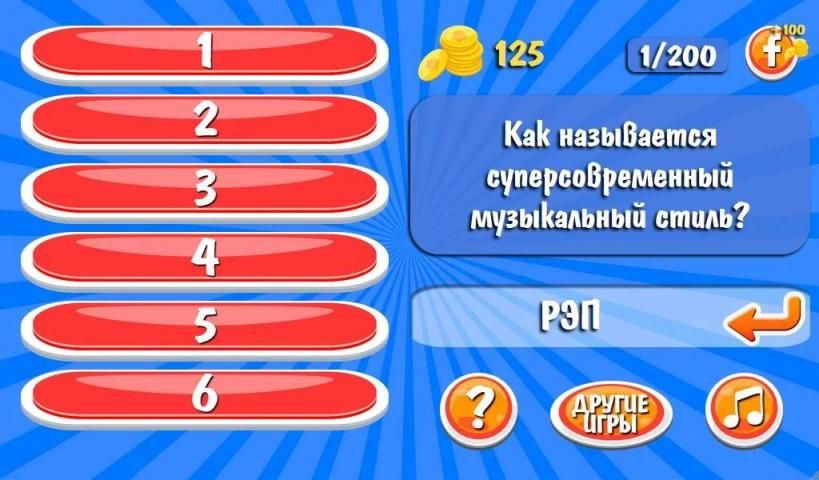 games 100 to one are very simple. At each level, a question will be asked, and your task will be to guess the 6 most popular answers to this survey among the people surveyed. At the beginning of each level you will be shown a question and six closed fields. At first glance, the task of guessing all the words seems very simple, but in fact you will be very surprised when you realize that your opinion will not always coincide with the opinion of the people surveyed, and the answers to the questions are not so easy to find. To move to a new question, you need to guess all 6 answers to the previous question.