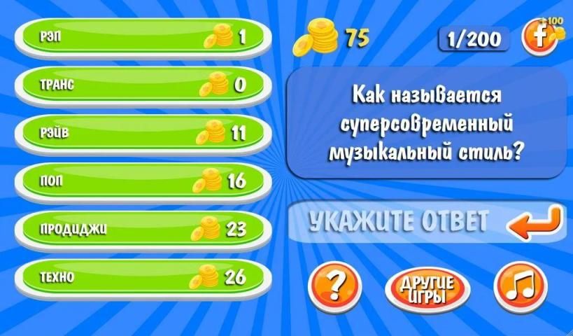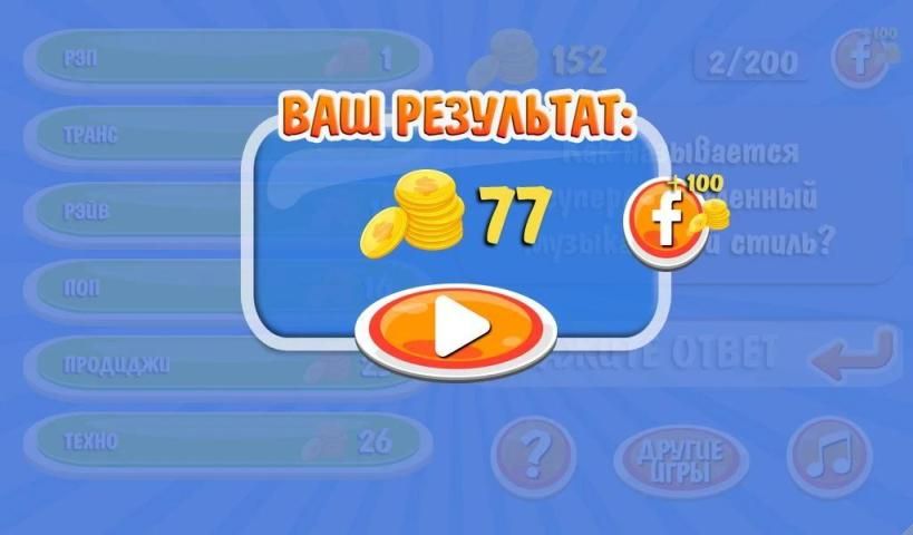 Отвечайте правильно на вопросы и ответы игры сто к одному (100 к 1), зарабатывайте как можно больше монет и отгадав сто вопросов не забудьте поделиться своими результатами с друзьями в Facebook и получить за это игровые монеты.