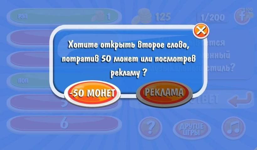 The game is one hundred to 1 there is an opportunity to open the correct answer for 50 game coins, or for viewing advertisements, but do not forget that, having bought a hint, there are no coins. Since the beginning of the game is given 125 game coins. Guessing the words, you will receive game coins for each of them. Each word has its own value, respectively, you will receive a different number of coins for the guessed words. For the first word you can get a maximum of 5 coins, but for the sixth maximum of 30 coins. When you open the correct answer, on the right on the green plate you can see the number of coins that you earned for this guessed word.