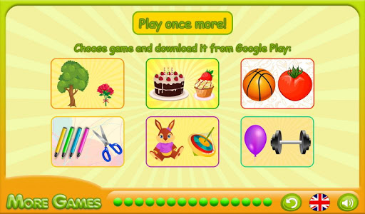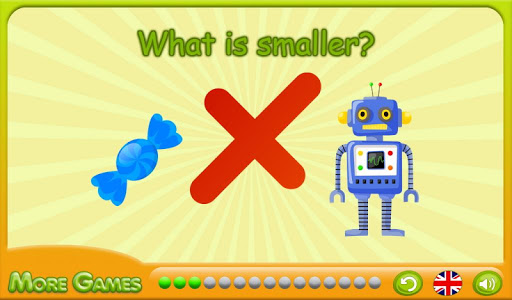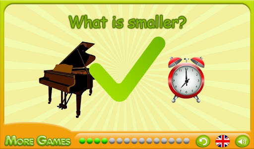 The game "It Is More Less" will become the excellent assistant in training with the child of such concept as the size of objects. At each level of game the child needs to choose a subject from two options which will be the correct answer to the question "What It Is More?" or "What It Is Less?". Game consists of 15 levels, but if you begin game repeatedly, then levels will differ from previous. Thanks to it, the kid it will be interesting to choose objects of the bigger or smaller size again and again. Game is followed by pleasant music, and at the end of passing of all levels the child will be able to polopat a finger the flying balloons and to choose new game.