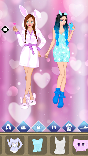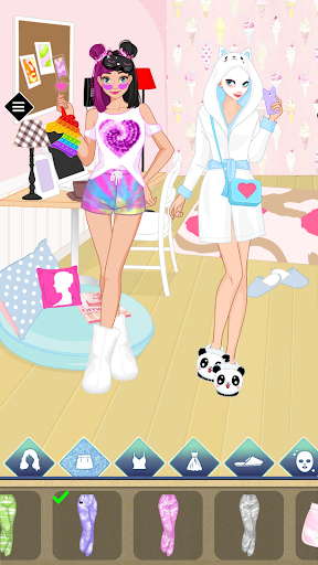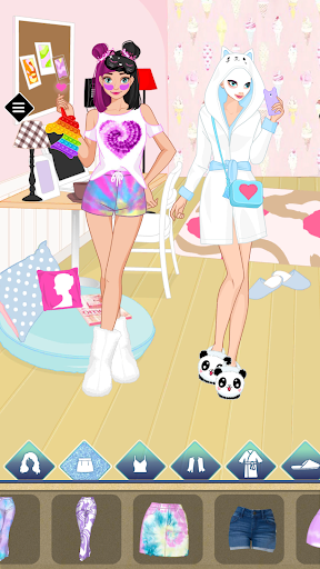 The last and most exciting stage in the game is the pajama party. After school, the adorable thing to do is to go to a friend for a sleepover. You can pick up comfortable cute slippers - pandas or slippers - bunnies, cute tops, shorts, make each other's hairstyles, try on various kigurumi, and make a face mask.