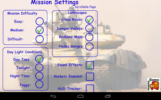 with other Tanks, Humvees and Orcas. Seek out and destroy Enemy units and Gun Sites, in Daylight, Night and Foggy conditions.