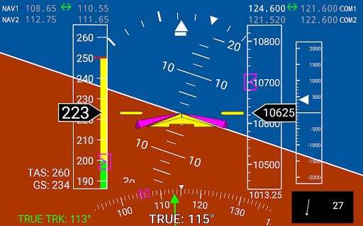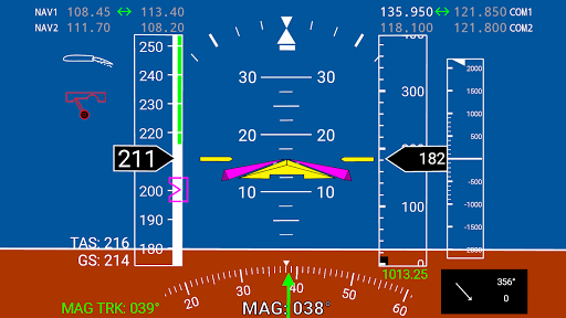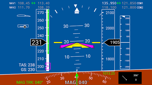 - Displays altitude, attitude, IAS, TAS, GS, heading, track, wind, altimeter setting, and flight director.