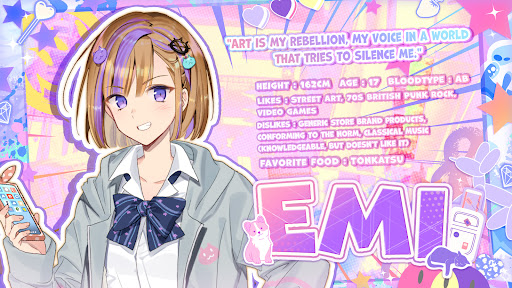 Introducing Emi Otoishi, a rebellious artist defying the status quo. Born into privilege, she forges her own path and breaks free from the constraints of traditional schooling. By day, she rebels against her family's expectations. By night, she thrives as a celebrated street artist. Challenged by her rival, Saki, Emi believes her inner struggles are more profound. Help shape the unpredictable destiny of free-spirited Emi or stay true to your unwavering bond with bestie Saki!