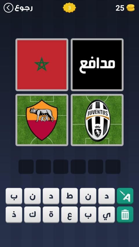 لعبة أربع صور لاعب 1 لعبة ذكاء و تحدي لتعرف على مشاهير كرة القدم العالمية و العربية مبنية على فكرة الكلمات المتقاطعة وصلة تحتوي على ألغاز مصورة صورة و لغز صعب و سهل مع الأجوبة الحل ستختبر معلوماتك في مجال كرة القدم لتعرف على أشهر لاعبي كرة القدم مثل رونالدو و ميسي نيمار و مبامبي و كذلك بعض اللاعبين المحترفين العرب كمحمد صلاح و بنعطية و رياض محرز و المزيد ... من خصائص اللعبة أنها ستعرض عليك أربع صور يجب عليك أن تحزر إسم اللاعب من خلال كتابة إسمه الصحيح ، إذا لم تتعرف على إسم اللاعب لا تقلق يمكنك إضهار الحرف الأول للاعب أو إخفاء ثلات حروف .