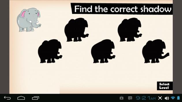 Shadow Match is excellent brain and sight game and it also helps children strengthen their visual discrimination skills by matching colorful pictures to their all-black shadows. Images are made for kids, they need to find fish, elephant, lion, giraffe, pig, rabbit, goat and lots of other shadows from animal kingdom.