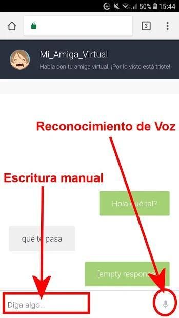 La conversación con su Amiga Virtual se ejecuta en el navegador para permitir la utilización del reconocimiento de Voz, por lo que tiene la opción de escribir las preguntas o hablar directamente al dispositivo.