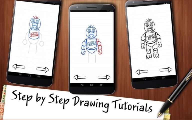 We offer you to dive into a whole new world with your smartphone and the cult Five Nights at Freddy’s game. If you want to learn something completely new and impressive - while drawing app - this is exactly what you need! Our team of artists and programmers has produced incredible tutorial that will teach you how to draw Five Nights characters, as a Chica, Banny, Bear step by step. The advantages of our application: