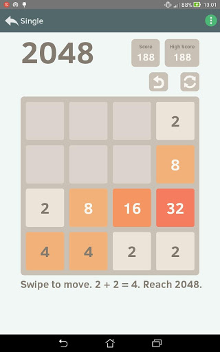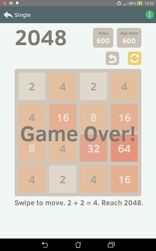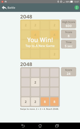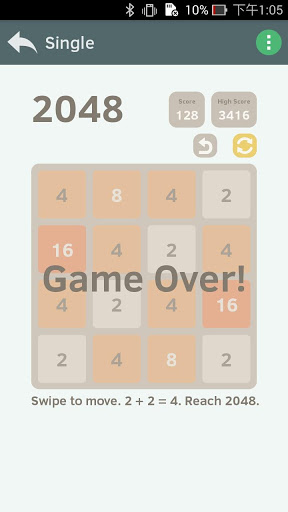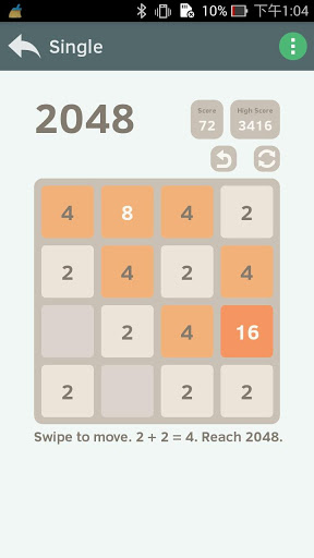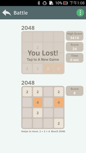 【遊戲說明】 輕掃以移動方塊,當兩個具有相同數字的方塊碰在一起,它們會合併成一個方塊。 當成功創造一個2048方塊,玩家便會獲勝。 【遊戲特色】 - 單人模式,經典2048遊戲! - 單人模式在獲勝後,可以選擇是否繼續挑戰。 - 雙人模式,使用藍芽與對方連線對戰,最快達到2048方塊便獲勝! - 雙人模式提供簡單的連線。 - 高分排行榜。 - 流暢的體驗。 - 我們重視您的意見 希望您享受這個遊戲!