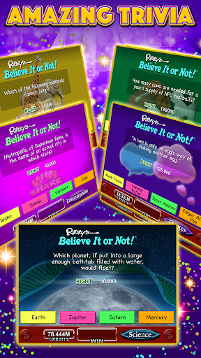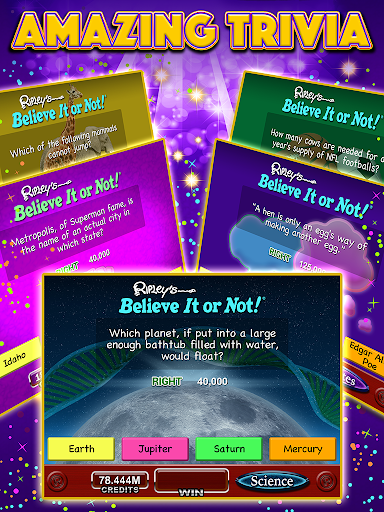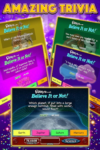 Double the Fun! Believe it or not, with Ripley’s Slots you can have the excitement of Las Vegas-style casino slots with awesome bonus games AND new quiz bonuses based on fun, cool and weird facts. Join the slots party with fun machines created by professional Vegas slot designers!