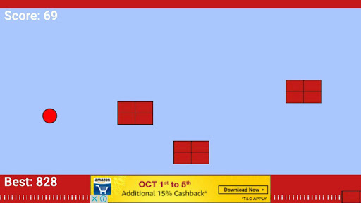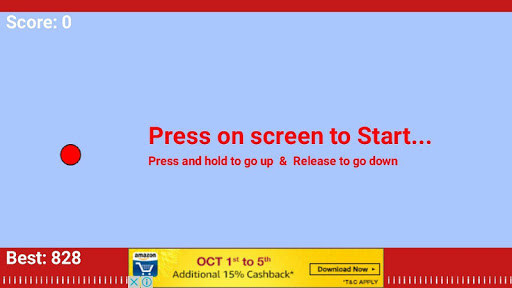 Simple press on screen to start the game and then press and hold screen to bounce ball up and release to ball let down. Ball should not touch top or bottom border or boxes comes from left to right... lets play and see who can make the high score...
