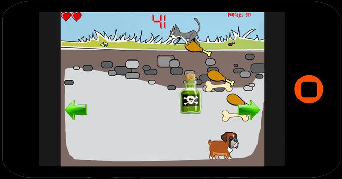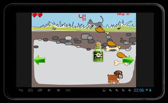 Move the dog from right to left and catch the food which is thrown by the cat, you have 60 seconds. But be CAREFUL!! if you hit with bottles of poison you lose 1 of your 3 lives. Let's play and increase your score every time.