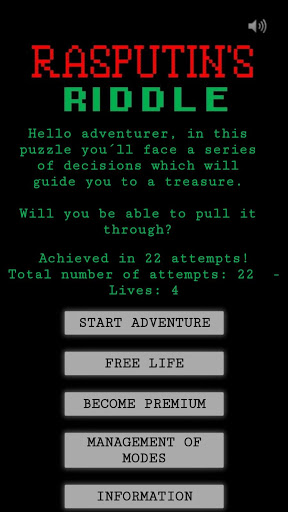 Solve this thrilling game by giving the correct answer to the questions that are being asked. Do not worry if you fail and die occasionally, you will always have a new attempt. Try to learn as much as possible of your successes and your mistakes to solve it in the least possible number of attempts. Are you ready?