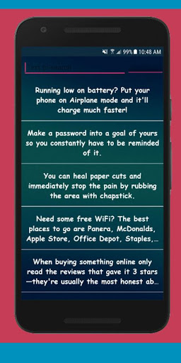 1000 Life Hacks، نصائح وحيل لتحسين حياتكتتوفر في هذا التطبيق الصغير.أنه يحتوي على نصائح للحياة والحيل التي من السهل مشاركةها وحفظها.