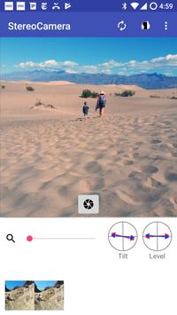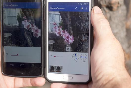 Use two Android devices to take true 3d pictures viewable with Google cardboard or other 3d headsets.
