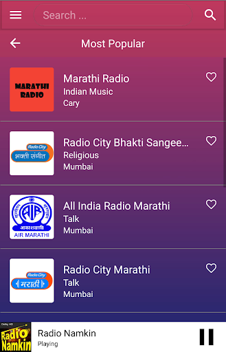 The best collection of online radios and FM radios for Marathi Language. More than 10 Marathi radio stations. This app is loaded with favourites list, sleep timer to auto shutdown FM after a time, sharing with friends, in-built volume control, background playing, retaining last played station on start.