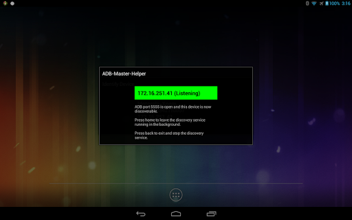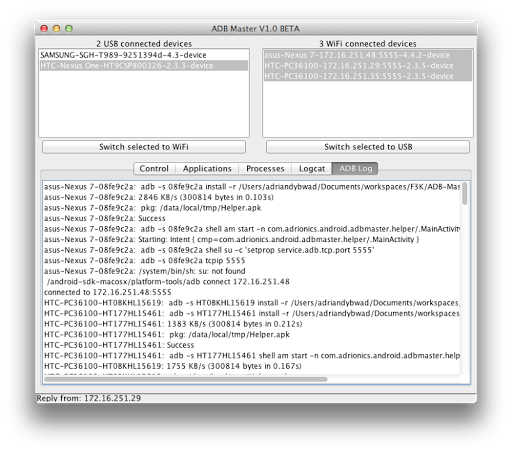 - USB connected devices with a button to switch the selected devices to WiFi (tcpip) mode. This will install “Helper.apk” to display adb state on the device and enable the device to be discovered by ADB Master.