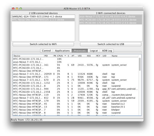 This section uses the command “adb shell top -m 20” to list the top 20 processes running on the device. It lists all selected devices in one view making it easy to monitor multiple devices at the same time. Future features include the ability to terminate processes and use custom top commands.