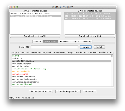6) Select one or more devices from the list of USB or WiFi connected devices to perform actions or view information on them...