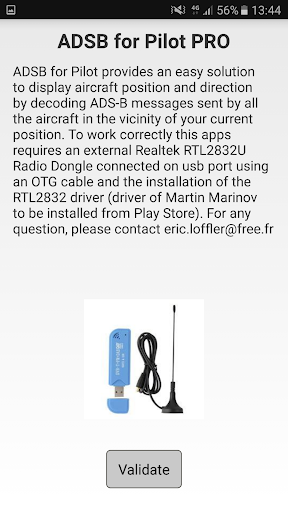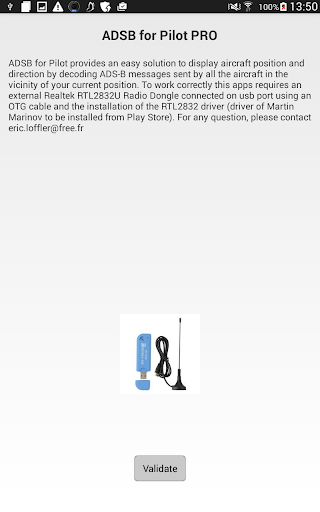 ADS-B for Pilot Pro is the improved version of ADS-B for Pilot. This App provides an easy solution to display aircraft positions and directions by decoding ADS-B messages sent by all the detected aircraft in the vicinity of the user current position. To work correctly, this apps requires an external Realtek 2832U radio dongle connected on the USB port using an OTG cable and the installation of the "RTL2832U driver" from Martin Marinov (to be installed from the Play Store).