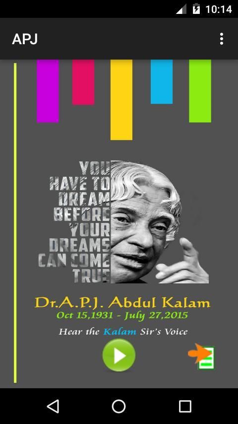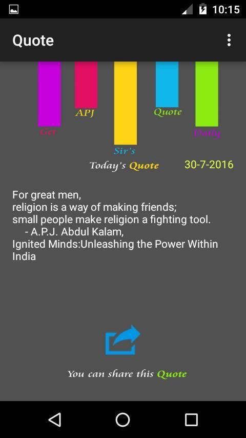 في جدولنا الزمني المزدحم ليس لدينا الوقت الكافي لقراءة صيغ من بعض التطبيقات person..This مستوحاة تم تطويره لتوليد نقلت والصياغات تحفيزية لسيدي عبد الكلام. بواسطة استخدام هذا التطبيق يمكننا أن نقرأ التطبيق الصياغات وسيدي أبو بكر زين العابدين في daily..This توليد ونقلت رائعة على استخدام basis..Make اليومي لهذا التطبيق والحصول على دوافع يوميا وتقاسمها بين أصدقائك ..