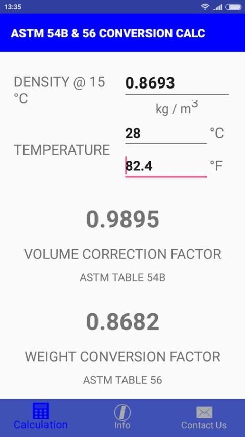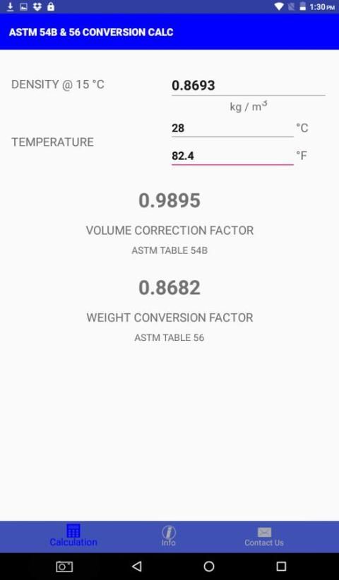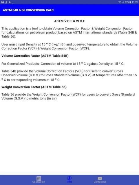 هذا التطبيق هو أداة للحصول على حجم تصحيح عامل والوزن معامل التحويل للحسابات على المنتجات النفطية استنادا إلى المعايير الدولية ASTM (الجدول 54B والجدول 56).